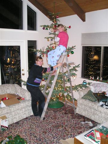 Cheryl and Katie decorating the tree. We had to cut three feet off the bottom because it was taller than we thought.