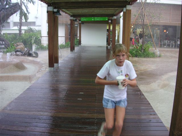 Shortly after arriving at Sentosa, we got a good tropical downpour. Here is Katie, trying to stay dry.
